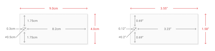 - Zie hieronder voor specificaties van het boorgat, hou hier altijd rekening mee in je ontwerp, zodat je niet onverwachts een gat midden in je logo hebt