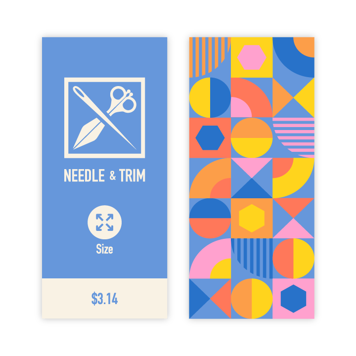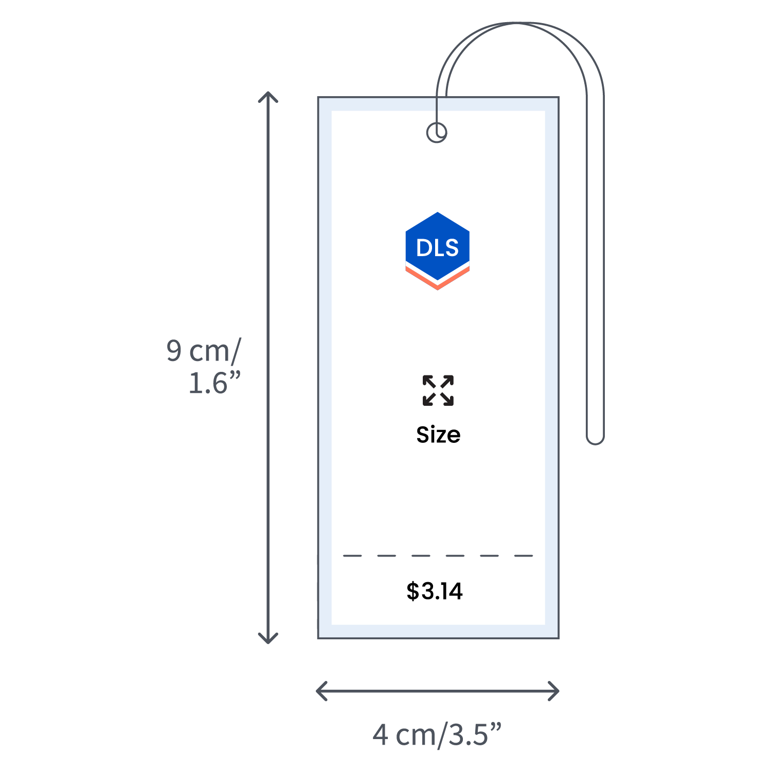 Onze hangtags zijn 4 cm breed en 9 cm lang. Gebruik contrasterende kleuren en vergeet in je ontwerp niet om ruimte vrij te laten voor het koordgaatje.